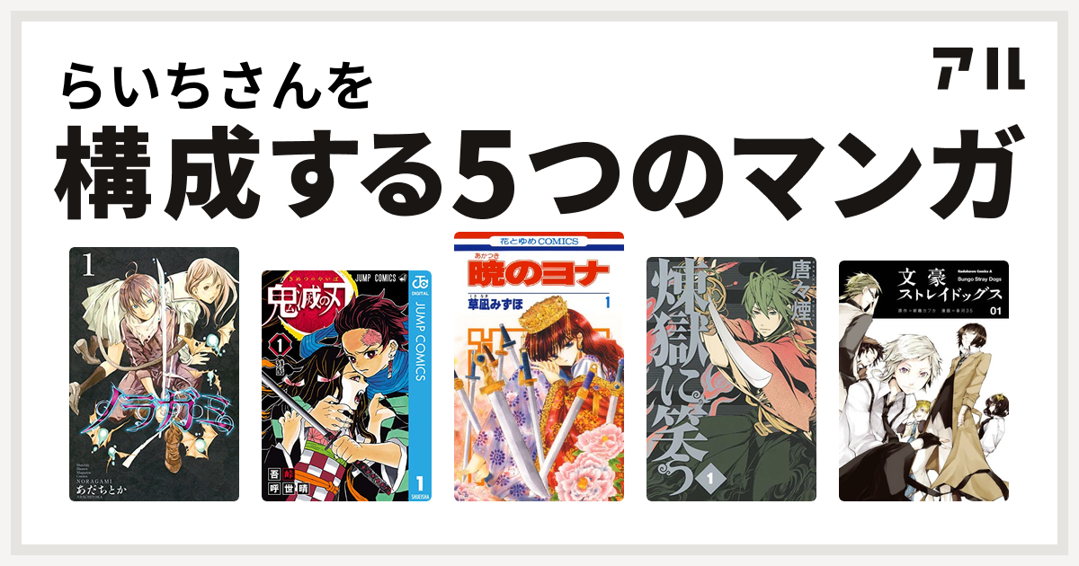 らいちさんを構成するマンガはノラガミ 鬼滅の刃 暁のヨナ 煉獄に笑う 文豪ストレイドッグス 私を構成する5つのマンガ アル